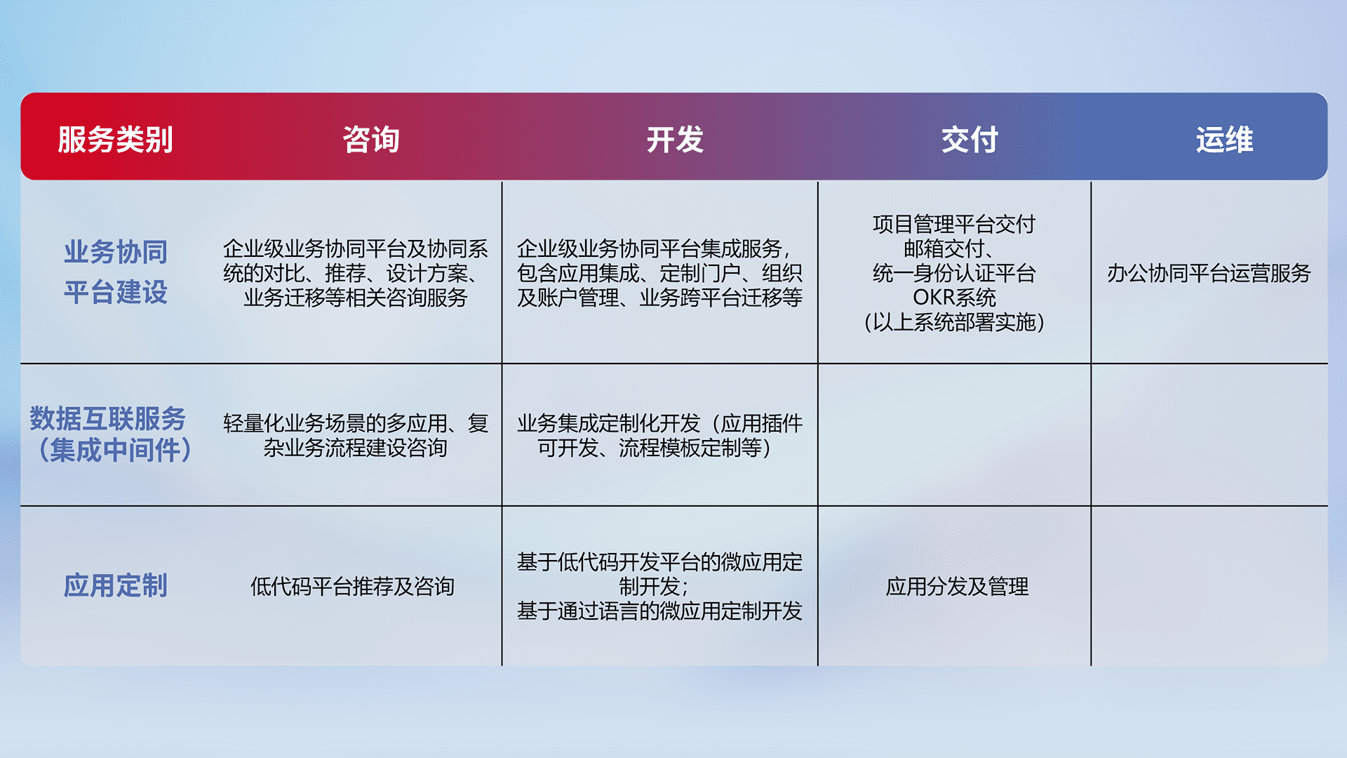 针对钉钉、、、企微、、、IDaas等平台级产品提供产品的规划、、、方案、、交付、、、、定制化开发等服务,,实现如统一协同办公、、、、智能客户服务、、混合会议管理、、、智能数据查询、、等业务场景,,,实现数字化转型。。。